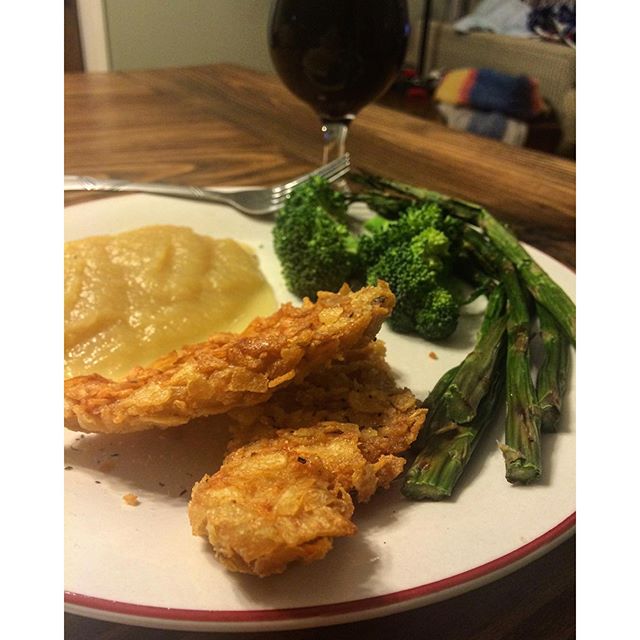 Am I trying to make myself feel better by putting green foods and applesauce on my plate with my potato chip chicken Schnitzel… Yes. But such is life π€ #kosher #themiracleofoil