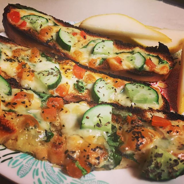 Cheesy garlic bruschetta on Challah. Toppings are garlic butter, butter lettuce, tomato, hard cheese, and cucumber. Served with sliced pear. Hubby is having wine too but I'm #pregnant. 😒 #food #foodporn #kosher #kosherfood #goodfood #lazydinner #sundaydinner #dairy #challah #challahbread #foodie