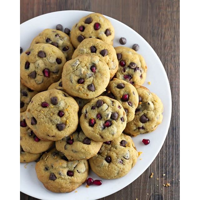 Chocolate Chip Pomegranate Cookies {recipe below}- OMG chocolate and pomegranate and orange zest make the PERFECT cookie. Who knew?! 👌🏻🍪🍊 These are a must for Tu B'Shvat (no I didn't just type random letters without looking, it's a Jewish holiday on Sunday that celebrates fruits like pomegranate!) I started with my absolutely favorite chewy chocolate chip cookies and added the star of the show (pomegranate) along with just the right amount of orange zest. Recipe here 👇🏻 2 ¼ cup all-purpose flour 1 tsp baking soda 1 cup butter or margarine, room temperature ¾ cup packed brown sugar (dark or light) ¼ cup white sugar 1 (3.4 ounce) package instant vanilla pudding mix 2 eggs 1 tsp vanilla extract 2 tsp orange zest 1 cup semisweet chocolate chips 3/4 cup pomegranate seeds, patted dry Preheat oven to 350 degrees. In a medium bowl, whisk together the flour and baking soda. In a large bowl, beat the butter, brown sugar, and white sugar with an electric hand mixer until creamy and smooth, about 1 minute. Add the instant pudding mix and beat until combined. Add the eggs, vanilla, and orange zest and beat until combined. Finally, add the flour mixture and beat until combined and a uniform batter forms. Stir or beat in the chocolate chips. Add the patted dry pomegranate seeds and gently fold into batter. Let the cookie dough chill in the refrigerator for 30-45 minutes. To form cookies, roll one inch balls of dough with your hands and place on an ungreased cookie sheet. You could also use a cookie scoop. Between batches, place remaining cookie dough in the fridge and take out when it’s time to roll the next batch. Bake for 9-11 minutes, or until the edges are a light golden brown. The cookies will not look done in the middle when you take them out of the oven (they will look pale and puffy), but trust the golden edges! They will continue to bake as they sit and cool. For a beautiful presentation, press a couple of chocolate chips and pomegranate seeds onto the tops of the cookies when they come out of the oven. Cool on the cookie sheet for as long as you can last without eating one. Enjoy! 🍪🙌🏻🍪🙌🏻