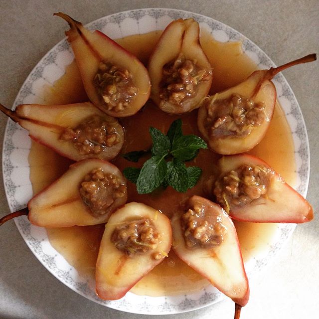 Dessert! Candied Ginger Pears ๐Ÿ Simple, easy, beautiful and delicious. Baked pears in apple and freshly squeezed ginger juice stuffed with chopped almonds cooked in brown rice syrup. ๐ŸƒMint leaf completes the yummy picture. #dessert #kosher #parve #healthykosher #vegan #fruit #pear #healthydessert #vegetarian #fitmom #eathealthy #sugarfree #grainfree #glutenfree #eggfree #vegansofig #ginger #foodstagram #healthyrecipes #instayum #foodpics #hclf #macrobiotic #GoodMoodFood #fruits #foodie #kosheryum #KosherFoodie #nomnom #healthykoshermadeeasy
