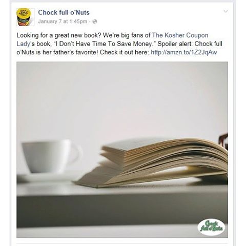 I wrote about Chock Full O'Nuts coffee in my book, 'I Don't Have Time To Save Money' and they were nice enough to give me a shout-out. My book is available on Amazon for $12.95. #Kosher #coffee #Book #reading #savemoney #budgeting #coupons #discounts #Shopping #extremecouponing #sales