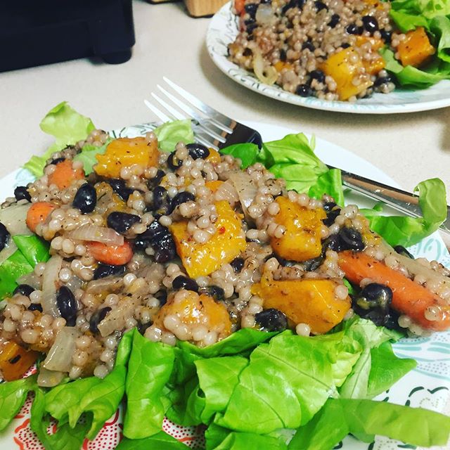 Israeli couscous with cheesy black beans, butternut squash, carrots, and onions over butter lettuce. 🍴#foodie #foodporn #healthyfood #healthyeating #kosher #kosherfood #healthycooking