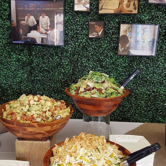 MGLA dedication, salads, photo backdrop #gourmet #salads #wood #rustic #growth #catering #partyplanning #upscale #kosher