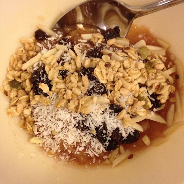 Mother Goose's #homemade #vegan #kosher #applesauce, topped with #shredded #coconut, @naturespathorganic #pumpkin #flax #granola, #raisins, and #slivered #almonds. #Fresh, #clean, and #sweet! :D