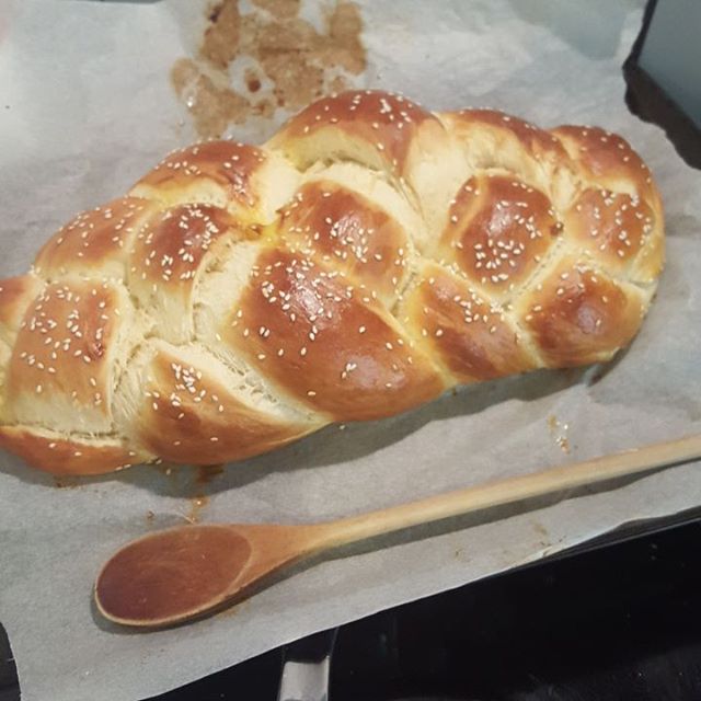 Must be Friday!! Just out of the oven. Wooden spoon for comparison of size (I ended up with a monster sized challah). A bit of the backstage on my snapchat 👻 viclichoch #challah #challahbake #homemade #Friday #fridaydinner