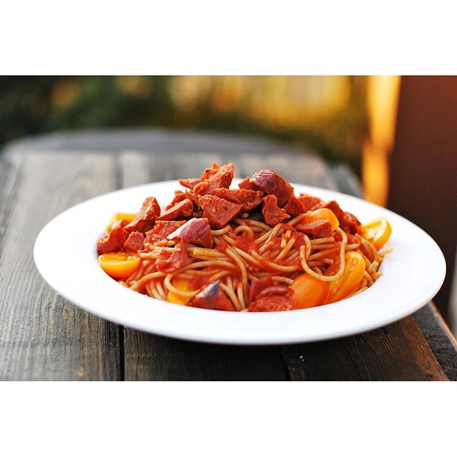 Post-lifting madness. What do we want?! Carbs + protein. When do we want it?! NOW. The anabolic window is real, people! Whole wheat pasta, Paesana marinara, tomatoes and spicy, grass-fed chorizo sausage from @growandbeholdfoods #boom #eatlikeachampion #grassfed #kosher
