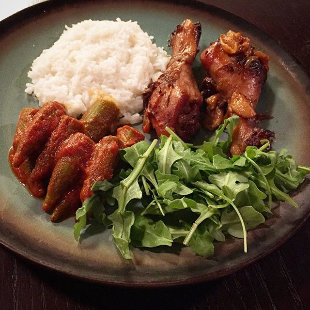 Soy and balsamic glazed chicken legs topped with caramelized onions and garlic. Side dishes: sticky white rice, garlic and tomato flavored okra served with a side of peppery wild arugula with a lime dressing #yummy #dinner #Whatareyoueatingfordinner? #sogood #healthy #fresh #flavor #homemade #kosher #cookingwithstyle #cookingwithstylekitchen #foodie #foodlove #foodart #foodporn #veggielovers #okra #chicken #tomato #simple
