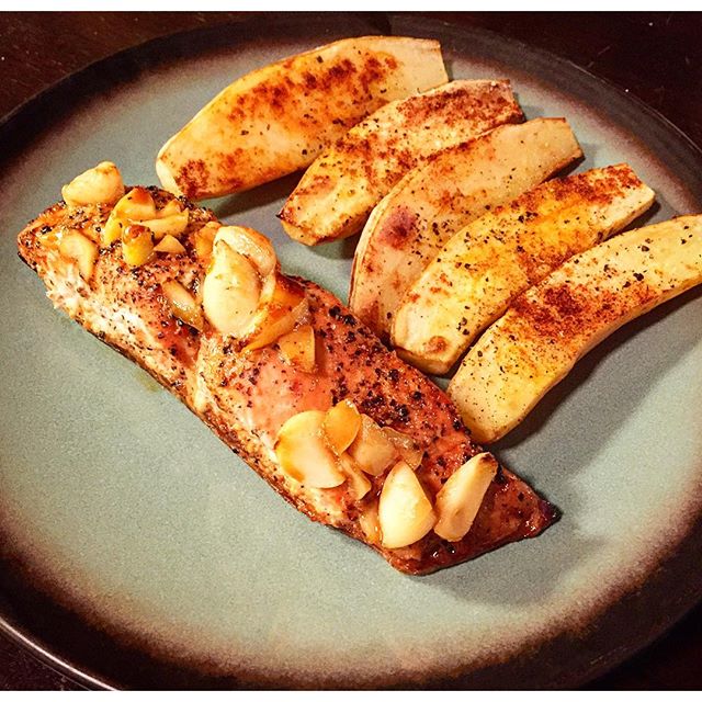 Soy glazed wild fresh salmon topped with fresh garlic and spiced farmers market fingering potatoes #yummy #delicious #devour #fish #wild #salmon #garliovers #fresh #flavor #healthy #spiced #cookingwithstyle #cookingwithstylekitchen #foodie #foodart #foodlove #foodporn #foodblogger #Venice #simple #potatoes #santamonicafarmersmarket #farmersmarketfinds #kosher