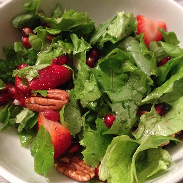 #Vegan #kosher #strawberry #pomegranate #pecan #salad! Part of tonight's #dinner yumz. I didn't like the dressing I drizzled this with though. What would you all suggest? :D