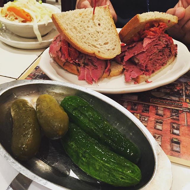 WorldPalate off to #JewishAmerican food 🇺🇸 : Piles of hot #pastrami goodness! With a side of #pickles and #coleslaw #sandwich #cucumber #2ndavenuedeli #secondavenuedeli #foodie #foodporn #deli #nycfoodandwine #newyork #iloveny #wanderlust #kosher #wanderlust #dinner